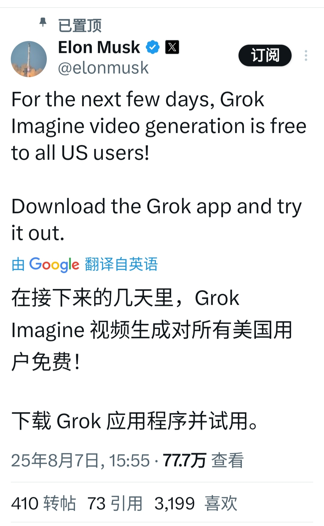 8月7日,马斯克在其社交媒体X上称,在接下来的几天里,Grok Imagine视频生成对所有美国用户免费。
